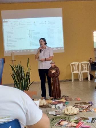 Após a colhida e café fraterno, iniciamos o encontro com o Ofício de Louvor e Intercessão pelo cuidado com a Criação, presidido por frei Zilmar Augusto, OFM. A seguir Irmã Ivoni nos falou com muita propriedade sobre o tema proposto. Segundo ela, tudo está interligado; o homem foi criado para cuidar da terra mãe e toda a criação. Porém, para que isso aconteça, devemos viver a fé em comunhão, estar por inteiro, ter abertura para o novo, ser disponíveis, ser homens e mulheres de oração, ter silêncio interior e exterior. Falou-nos ainda sobre a busca franciscana no sentido do querer, do desejo de mudança de hábitos e conduta, do cultivo da cultura do diálogo e do encontro. Chamou-nos a atenção para importância da ecologia em todos seus aspectos e dimensões: ambiental, econômica, social, cultural, ecologia da vida cotidiana e princípio do bem comum. Pois, a visão da ecologia integral, deve nos motivar a ter com todo nosso ser, gratidão, respeito, admiração e compromissos firmes de cuidar e preservar nossa mãe terra. Toda a sua reflexão foi ilustrada com documentários do Papa Francisco sobre a Laudato Si’, e também do Teólogo Franciscano Leonardo Boff sobre a Ecologia integral.