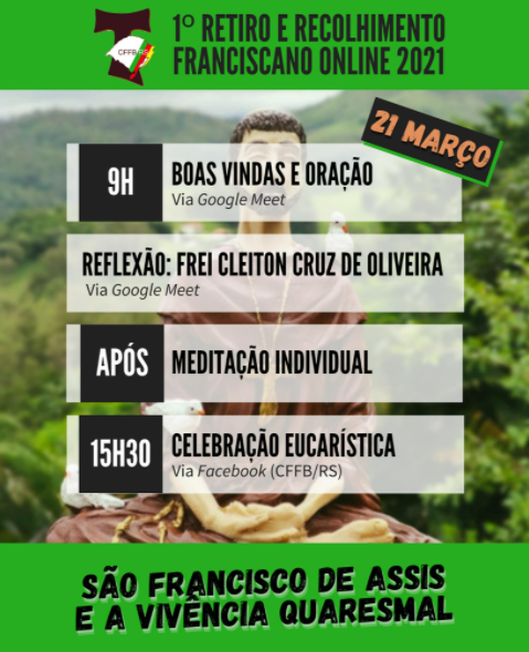 No próximo dia 21 de março, domingo, a CFFB/RS estará promovendo o primeiro Retiro e Recolhimento Franciscano Online de 2021.