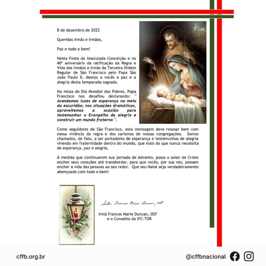 Download 8 de dezembro de 2022 Queridas Irmãs e Irmãos, Paz e todo o bem! Nesta Festa da Imaculada Conceição e no 40º aniversário da ratificação da Regra e Vida dos Irmãos e Irmãs da Terceira Ordem Regular de São Francisco pelo Papa São João Paulo II, desejo a vocês a paz e a […]