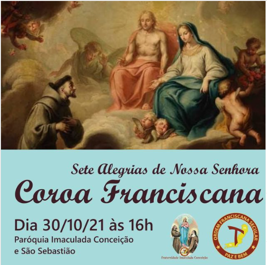 Com muita alegria franciscana e seguindo todos os protocolos a Ordem Franciscana se reunirá presencialmente no próximo dia 30/10 às 16h para rezar a Coroa Franciscana! O encontro será no seguinte endereço: Rua Catulo Cearense, 26, Engenho de Dentro – Rio de Janeiro – RJ – Paróquia Imaculada Conceição e São Sebastião.