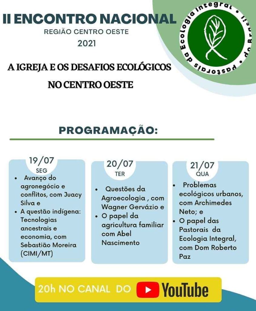 PASTORAIS DA ECOLOGIA INTEGRAL DO BRASIL AGENDA 2021 II ENCONTRO NACIONAL A Igreja e os desafios ecológicos no Centro Oeste Dias: 19, 20 e 21 de Julho de 2021 ( Segunda, terça e quarta feira) das 20.0 h. `as 21:30 horas (horário de Brasília) e 19.0 H `as 20.30 h. Horário de MT e MS. […]