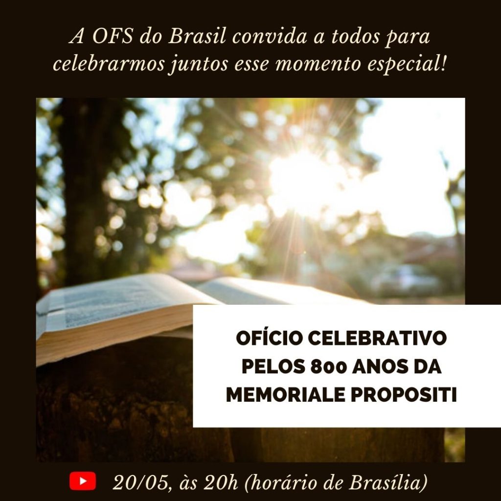 Paz e bem, irmãos e irmãs! É com grande júbilo que a OFS do Brasil convida nossa imensa Fraternidade Nacional para celebrarmos juntos os 800 anos da Memoriale Propositi! 🤎 Vamos rezar juntos um ofício celebrativo no dia 20/05, às 20h (horário de Brasília). O momento será transmitido pelo Youtube no link abaixo. Contamos com […]
