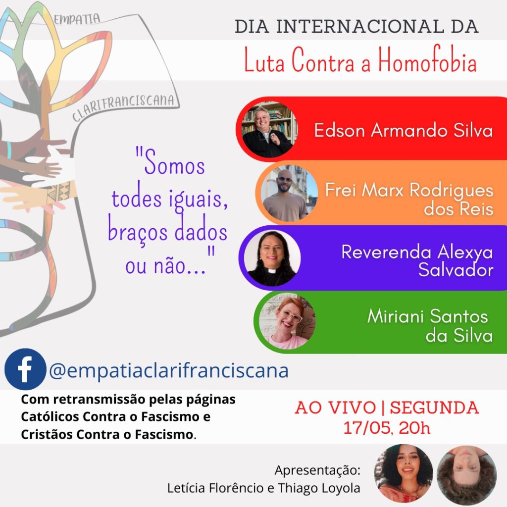 O Coletivo Empatia Clarifranciscana apresenta sua primeira live: “Somos todes iguais, braços dados ou não”. Ah, já ativa o lembrete e segue a página…rs’. A data é especial: 17 de maio, Dia Internacional Contra a Homofobia, às 20h, no canal no facebook. Participantes: ➡️ Reverenda Alexya Salvador, casada, mãe de três filhos, professora da rede […]