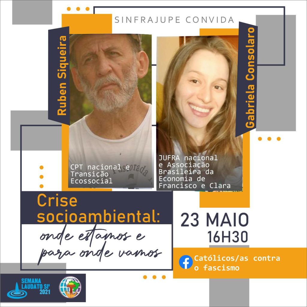 Dia 23 de Maio, às 16:30 (horário de Brasília) Ao vivo Facebook: https://www.facebook.com/Sinfrajupe/ https://www.facebook.com/catolicospelapaz/ O “Chamado por uma Transição Ecossocial” e a Economia de Francisco e Clara dialogam na busca de alternativas capazes de interromper o atual ciclo de destruição socioambiental provocada pelo capitalismo. Ruben Siqueira – CPT e Transição Ecossocial e Gabriela Consolaro – […]