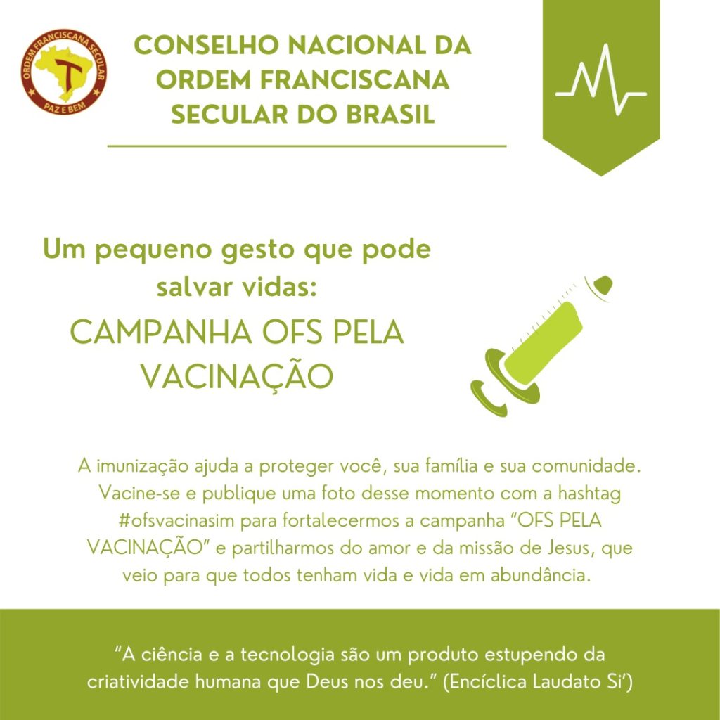 CAMPANHA OFS PELA VACINAÇÃO #ofsvacinasim Paz e bem, irmãos e irmãs! “A ciência e a tecnologia são um produto estupendo da criatividade humana que Deus nos deu.” (Encíclica Laudato Si’) A OFS do Brasil, entendendo que a Ciência, dom de Deus, oferece soluções técnicas que podem ajudar a resolver graves problemas do mundo e preservar […]