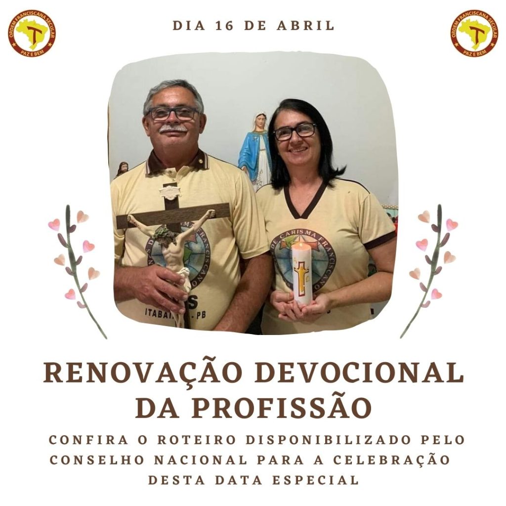 Download Paz e bem, irmãos e irmãs! É com grande alegria que a Equipe Nacional de Formação disponibiliza uma proposta de roteiro para a Celebração da Renovação Devocional da Profissão, a ser celebrada neste dia 16 de abril. Nesse dia todos os irmãos e irmãs professos/as na Ordem Franciscana Secular são convidados/as a realizarem a […]