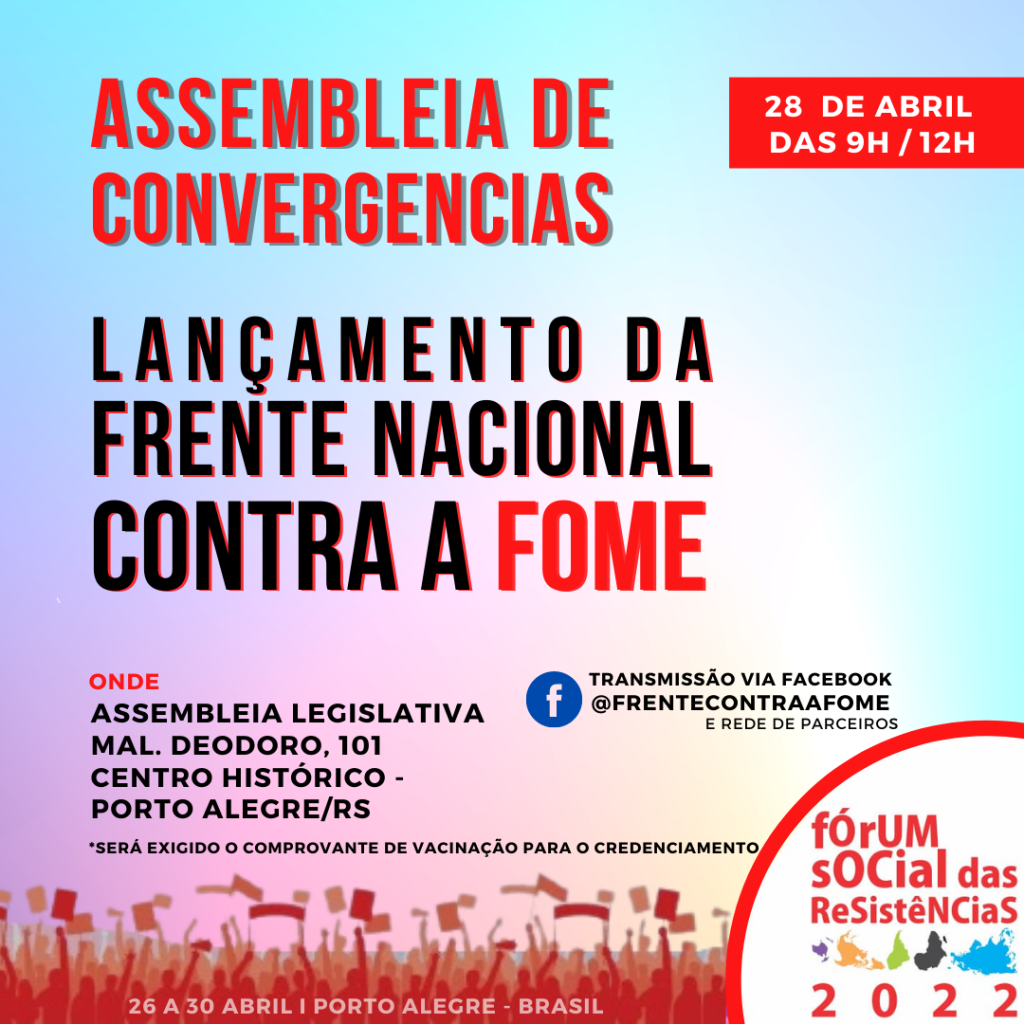 O lançamento da Frente Nacional contra a Fome está chegando! A Assembleia de Convergência acontece no âmbito do Fórum Social das Resistências nessa próxima quinta-feira (28 de abril), em Porto Alegre – RS, com transmissão ao vivo. A pandemia do Covid 19 explicitou a FOME que já assolava os povos do campo, da cidade, […]