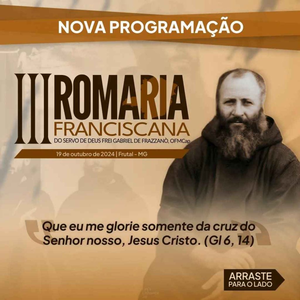 Confira a programação da III Romaria Franciscana do Servo de Deus Frei Gabriel de Frazzanò, OFMCap, com realização no dia 19 de outubro em Frutal – MG. CLIQUE AQUI e acesse a programação em PDF.