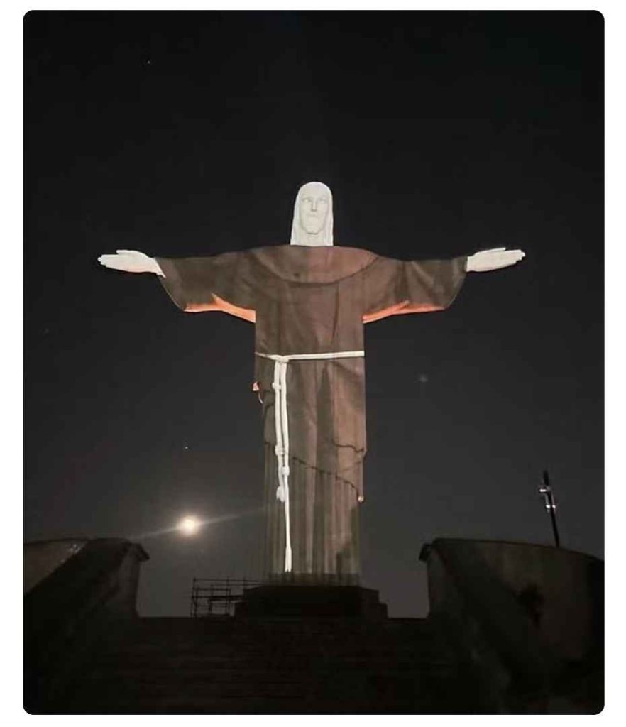 Cristo Redentor é iluminado com as roupas franciscanas de Frei Galvão, 1° santo brasileiro