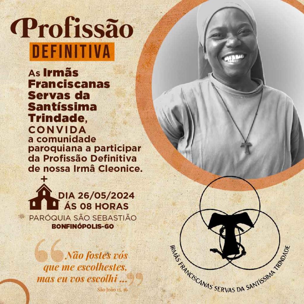 As Irmãs Franciscanas Servas da Santíssima Trindade convida toda a Família Franciscana para festejarem, a Profissão Definitiva da irmã Cleonice Barbosa dos Santos. Dia: 26/05 Horário: 08h Local: Paróquia São Sebastião em Bonfinópolis, GO