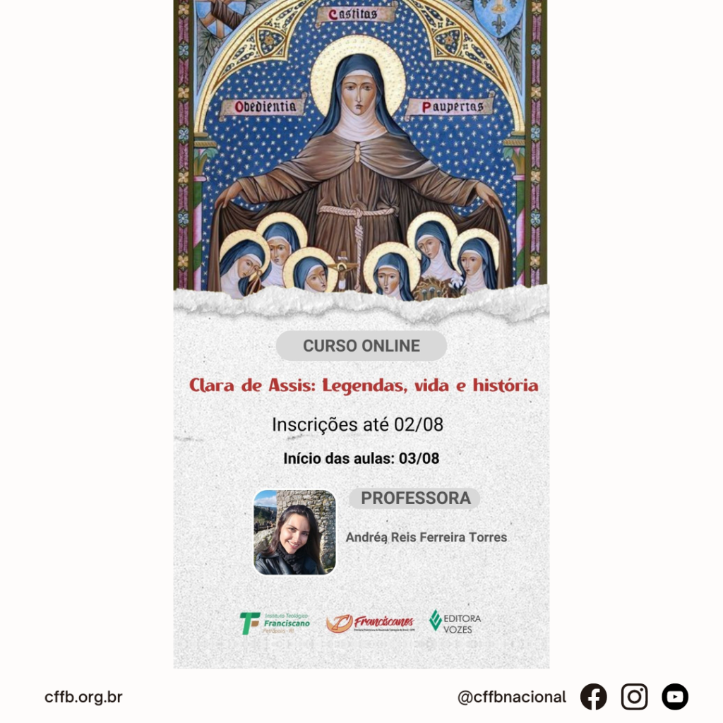 As aulas serão realizadas as quintas-feiras, nos dias 03, 10, 17, 24 e 31/08/2023, de forma remota, através da ferramenta Google Meet, de forma síncrona. Horário: 19h30 as 21h30. O pagamento do curso será em uma parcela de R$ 60,00, no ato da inscrição. Objetivos Apresentar a trajetória de Clara de Assis como fundadora da ordem das Damas Pobres de […]