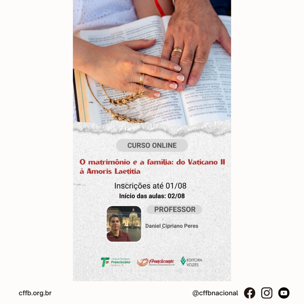 As aulas serão realizadas as Quartas-feiras, nos dias 02, 09, 16, 23 e 30/08/2023, de forma remota, através da ferramenta Google Meet, de forma síncrona. Horário: 19h30 as 21h30. O pagamento do curso será em uma parcela de R$ 60,00, no ato da inscrição. Objetivos Destacar a importância da família como sujeito protagonista da evangelização junto com a Igreja e […]