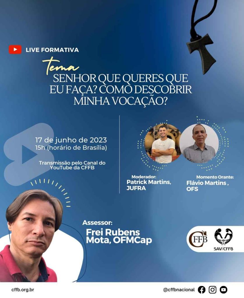 A live é composta por Frei Rubens Mota, OFMCap (assessor), Patrick Martins, JUFRA (moderador) e Flávio Martins da Silva, OFS e Coordenador da CFFB AL (momento orante). O SAV, Serviço de Animação Vocacional da CFFB, promove sua primeira live formativa do ano com o tema: “Senhor que queres que eu faça? Como descobrir minha vocação?“. […]