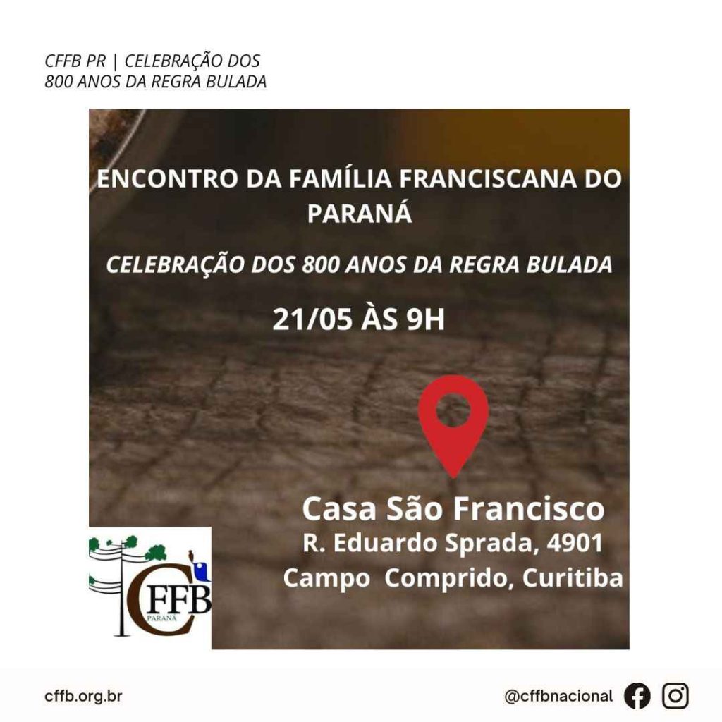 Inscreva-se Irmãos e irmãos, paz e bem. A Conferência da Família Franciscana do Paraná, convida a todos os franciscanos a participarem do Encontro que celebrará os 800 anos da Regra Bulada. O encontro será assessorado pelo frei Márcio José Tessaro, OFMCap. O evento acontecerá no dia 21 de maio, na Casa São Francisco dos Frades […]