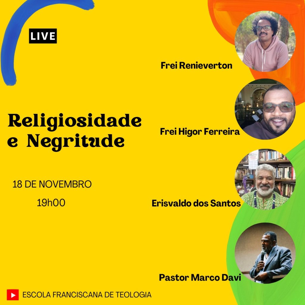 Escola Franciscana de Teologia convida para Live Religiosidade e Negritude. A live será dia 18 de novembro às 19h. E terá a presença de Frei Renieverton, Frei Higor, Pastor Marco Davi e Erivando dos Santos. Acompanhe no Canal do YouTube Escola Franciscana de Teologia