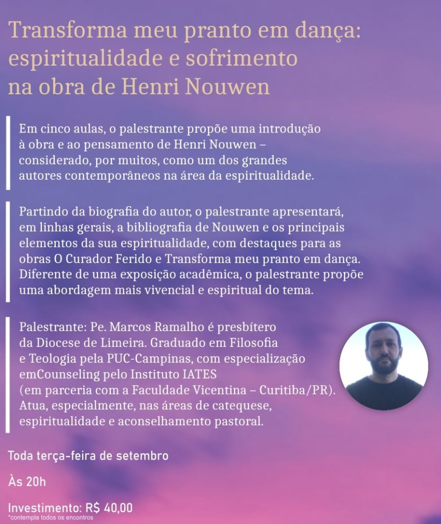 Transforma meu pranto em dança: Henri Nouwen e a nossa capacidade de transformar o sofrimento em espiritualidade O curso propõe uma introdução à obra e ao pensamento de Henri Nouwen – considerado, por muitos, como um dos grandes autores contemporâneos na área da espiritualidade. Partindo da biografia do autor, o palestrante apresentará, em linhas gerais, […]