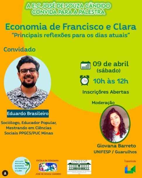 Escola de Cidadania José de Souza Candido, convida para formação sobre a Economia de Francisco e Clara