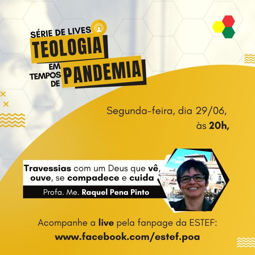 Nesta segunda-feira (29/06), às 20h na fanpage da Estef, Escola Superior de Teologia, a sequência de lives “Teologia em Tempos de Pandemia”. O tema desta live é “Travessias com um Deus que vê, ouve, se compadece e cuida” com a professora Raquel Pena Pinto. Fonte: ESTEF