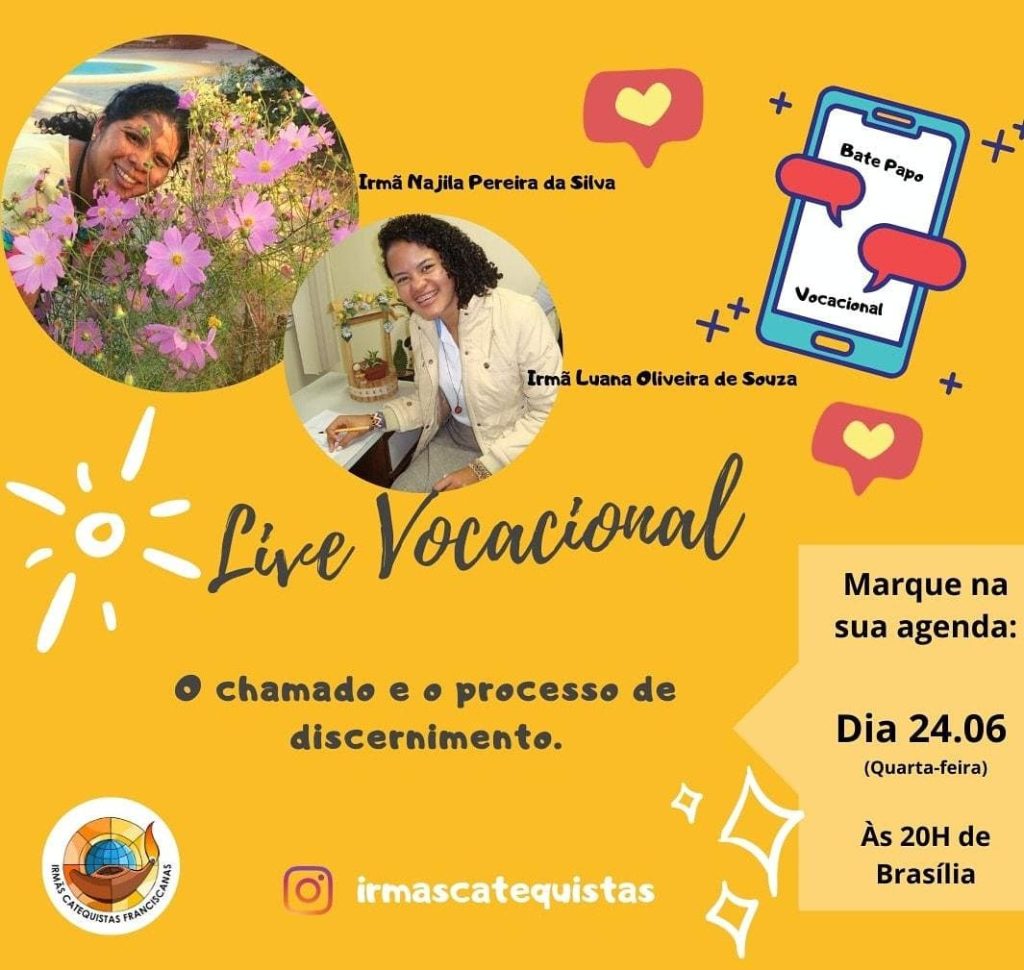 As irmãs Najila e Luana irão partilhar sobre o chamado e processo vocacional das Irmãs Catequistas Franciscanas! Nesta quarta-feira, às 20h de Brasília, na página do Instagram @irmascatequistas Fonte: Irmãs Catequistas Franciscanas