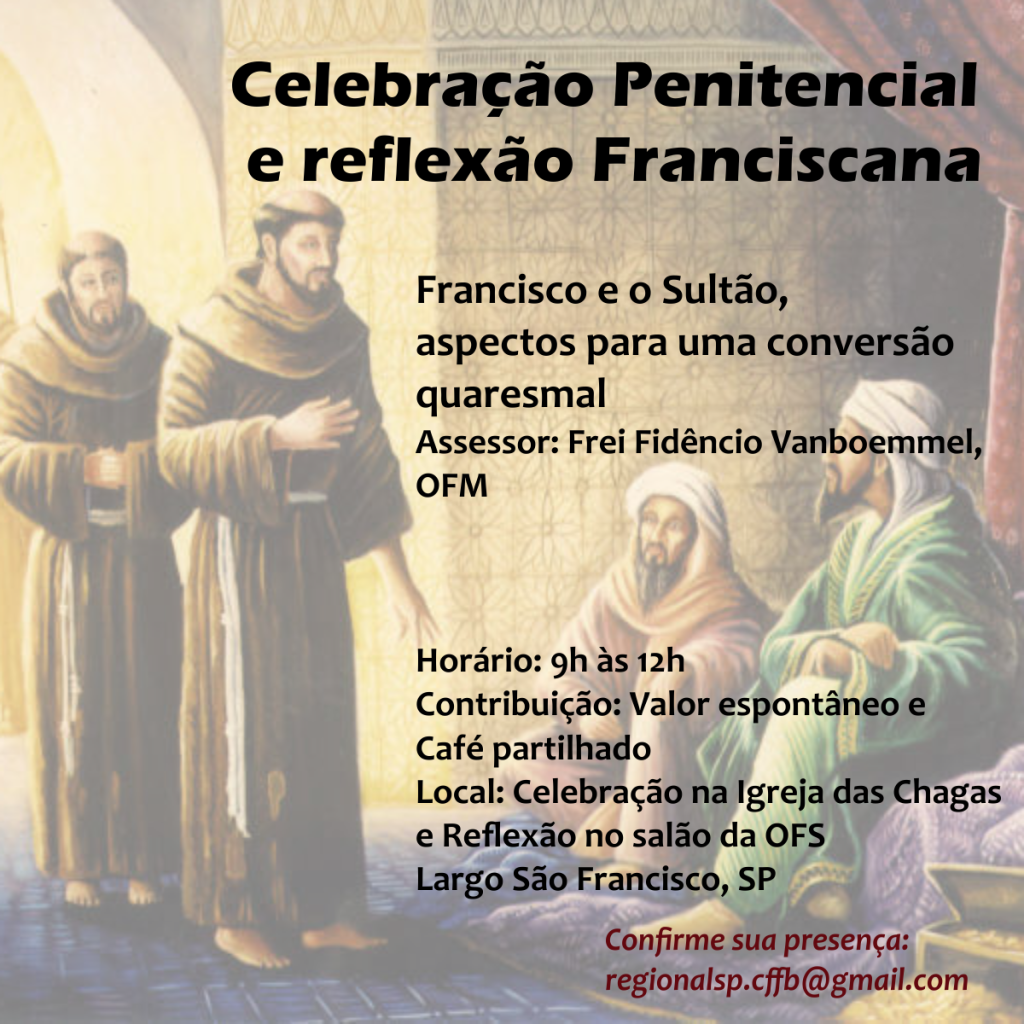 Irmãos, paz e bem! Amanhã, 06 de abril, o Regional da CFFB realizará uma Celebração Penitencial e reflexão Franciscana com a Assessoria do Frei Fidêncio Vanboemmel, OFM. Horário: das 09h às 12h Celebração na Igreja das Chagas e Reflexão no salão da OFS – Largo São Francisco, SP Obs: Traga um prato com salgados ou […]