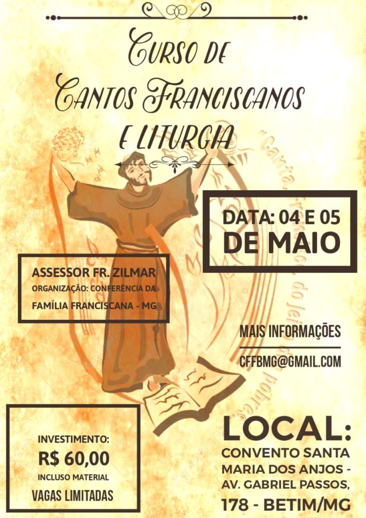 É com grande alegria que a Família Franciscana de Minas Gerais traz a nosso estado o Curso de Cantos Franciscanos e Liturgia. Com Assessoria de Fr. Zilmar, este curso já é ministrado pelo Brasil de forma a espalhar o Carisma Franciscano através da Arte. Data: 04 e 05 de Maio Local: Convento Santa Maria dos […]