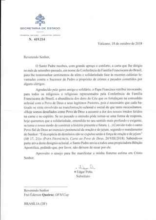 Nunciatura Apostólica envia resposta do Papa Francisco à Conferência da Família Franciscana do Brasil em razão da Carta Oficial enviada ao Santo Padre. Clique aqui e leia a resposta na íntegra. http://issuu.com/familiafranciscanadobrasil/docs/resposta_carta_nuncio_apostolico Leia a Carta Oficial da CFFB ao Papa Francisco.