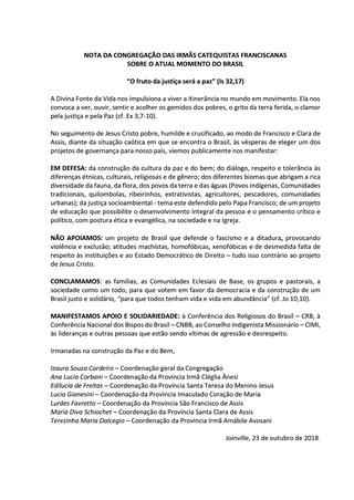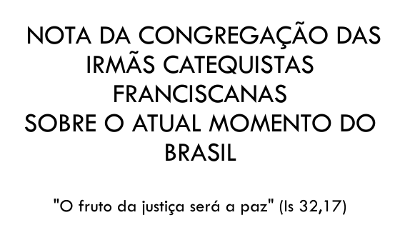 NOTA DA CONGREGAÇÃO DAS IRMÃS CATEQUISTAS FRANCISCANAS SOBRE O ATUAL MOMENTO DO BRASIL