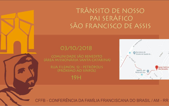 Hoje, 03 de outubro de 2018, a Família Franciscana de Manaus celebra o Trânsito de São Francisco de Assis. A Celebração será na Comunidade São Benedito, as 19h, na Área Missionária Santa Catariana. Rua Filemon, 12, Petrópolis, próximo ao SINPOL. Após a celebração teremos um jantar partilhado