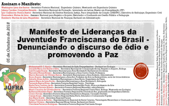 Irmãs e Irmãos, Paz – fruto da justiça – e todo Bem! Nós, jufristas, membros do Secretariado Fraterno Nacional e Secretários/as Fraternos/as Regionais da Juventude Franciscana do Brasil, assinamos em comunhão esse manifesto histórico que é lançado dentro de um contexto político, mas também dentro de um processo formativo da Juventude Franciscana. Construído a partir das bases, […]