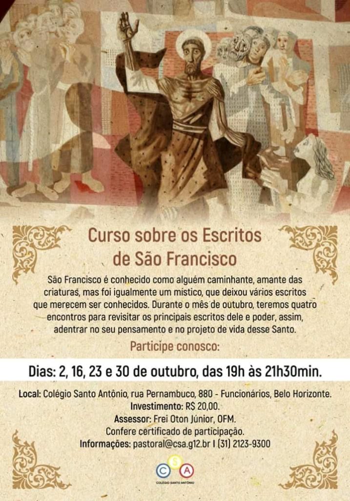 São Francisco é conhecido como alguém caminhante, amante das criaturas, mas foi igualmente místico, que deixou vários escritos que merecem ser conhecidos. Durante o mês de outubro, teremos quatro encontros para revisitar os principais escritos dele e poder, assim, adentrar no seu pensamento e no projeto de vida desse Santo. • Dias: 02, 16, 23 […]