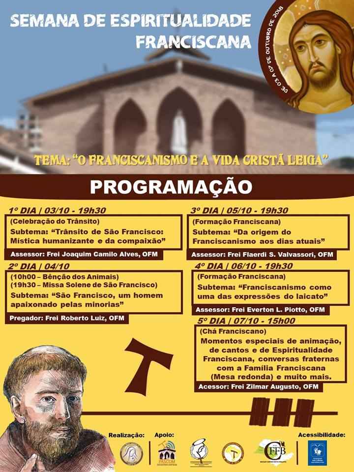 Com o tema “O franciscanismo e a vida cristã leiga” a Semana de Espiritualidade Franciscana acontece de 03 a 07 de outubro. Se informe em Paróquia Nossa Senhora de Fátima
