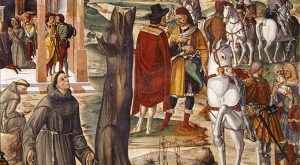 Ezelino II de Roma, verdugo e tirano, a quem Dante imortalizou como condenado entre os criminosos sanguinários mergulhados em seu próprio sangue, continuava a sacrificar vítimas inocentes. Imitando o gesto desassombrado do mestre, o Bem-aventurado Lucas também teve a coragem de se apresentar diante dele em Ansedísio, censurando-o pelas injustiças e os delitos. Ezelino sentenciou: “Frei Lucas seja perdoado, mas a sua família seja condenada ao desterro”. E a sentença teve de ser cumprida.