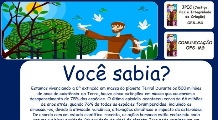 Continuando a “Campanha Você Sabia?”, uma parceria entre os serviços de JPIC e Comunicação do Regional da OFS/MG, lançamos hoje a nossa terceira reflexão. Que ela fortaleça em nós o desejo de ajudar na Construção da Civilização do Amor, um mundo mais justo, pacífico e voltado para a ecologia integral. Nessa perspectiva observamos e conectamos o ser humano, a sociedade e o planeta, como nos convida o Papa Francisco na encíclica Laudato si’. Que tal repassar a imagem e a mensagem para que mais pessoas conheçam a campanha e se conscientizem?!