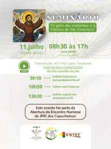 No dia 11 de julho, será realizado em Porto Alegre o seminário “O Grito das Enchentes e o Cântico de São Francisco”, promovido pelo Serviço de Justiça, Paz e Integridade da Criação (JPIC) dos Capuchinhos do Brasil. O evento acontecerá das 8h30 às 17h, na Escola Superior de Teologia e Espiritualidade Franciscana (ESTEF), localizada na Rua Tomaz Edison, 212, bairro Santo Antônio.