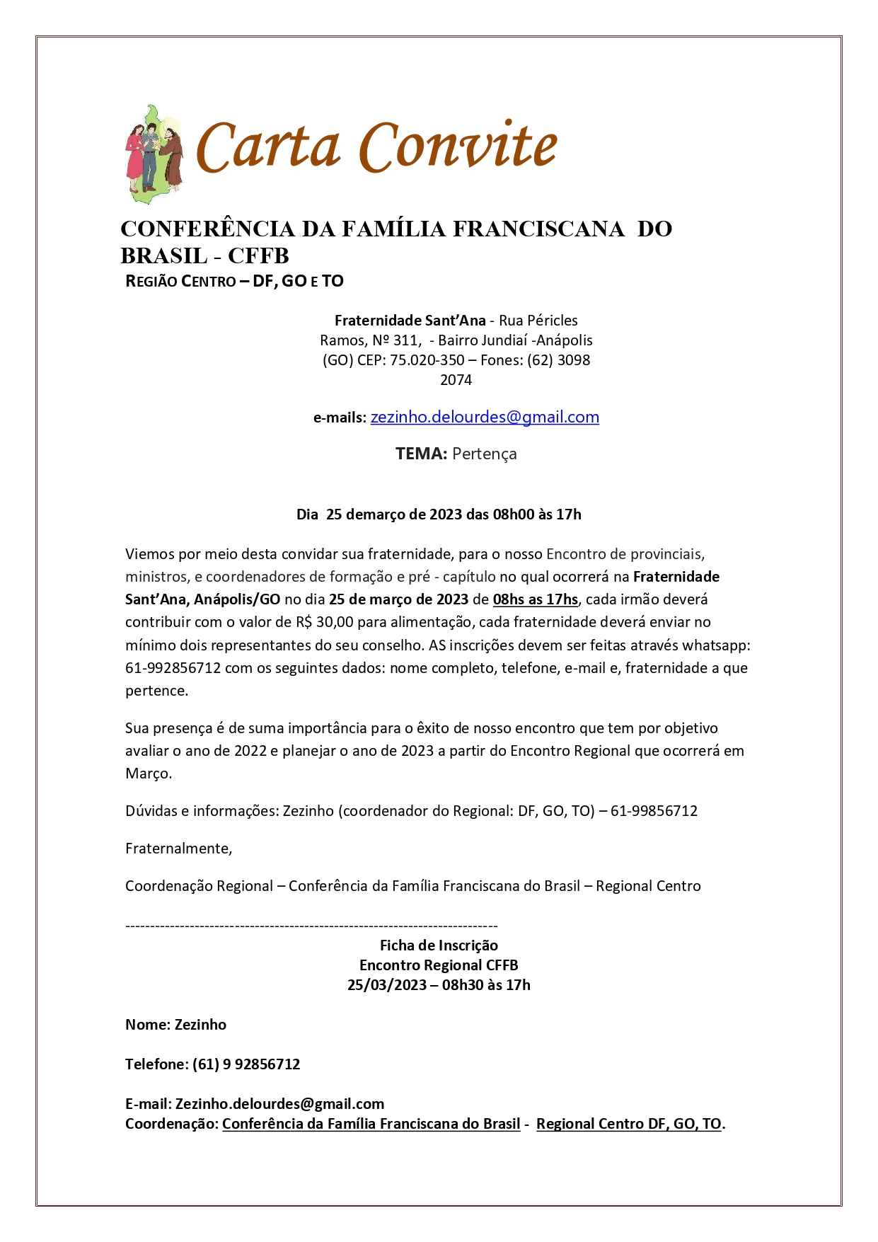 Dúvidas e informações: Zezinho (coordenador do Regional: DF, GO, TO) – 61-99856712 Fraternalmente,