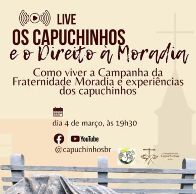 A Conferência dos Capuchinhos do Brasil convida para a live: Os Capuchinhos e o Direito à Moradia, a ser realizada no dia 04 de março às 19h30min no YouTube @capuchinhosbr
