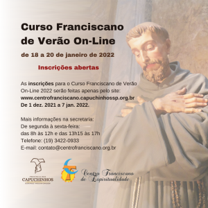 • As inscrições para o Curso Franciscano de Verão On-Line 2022 serão feitas apenas pelo site: www.centrofranciscano.capuchinhossp.org.br, de 1 dez. 2021 a 7 jan. 2022.