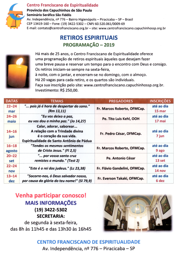 Há mais de 25 anos, o Centro Franciscano de Espiritualidade oferece uma programação de retiros espirituais àqueles que desejam fazer uma breve pausa e reservar um tempo para o encontro com Deus e consigo.