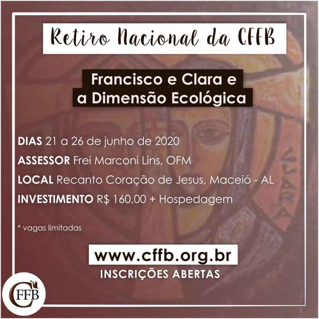 A Conferência da Família Franciscana do Brasil convida as irmãs e irmãos a participarem do Retiro Nacional da CFFB. Será um momento de aprofundamento da Espiritualidade Francisclariana, tendo como tema: Francisco e Clara e a dimensão ecológica, assessorado por Frei Marconi Lins de Araújo, OFM, Província Franciscana de Santo Antônio do Brasil, Recife, Ministro Provincial (2006-2014), desde 2015, Reitor do Santuário de São Francisco das Chagas, Canindé, CE.