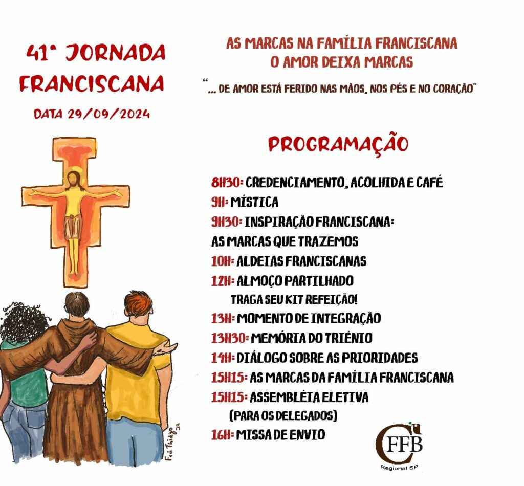A Conferência da Família Franciscana Regional São Paulo, convida para participar da 41ª Jornada Franciscana, a ser realizada no dia 29 de setembro de 2024, das 09h às 17h, no CONSA – Colégio Franciscano Nossa Senhora Aparecida, localizado na Avenida Juriti, 368, Vila Uberabinha, São Paulo – SP. Participem!