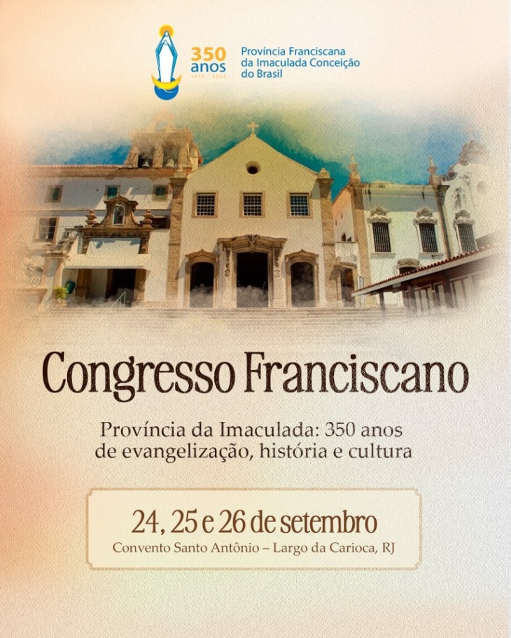 Em comemoração aos 350 anos da criação da Província Franciscana da Imaculada Conceição do Brasil, será realizado o Congresso Franciscano Província da Imaculada: 350 anos de Evangelização, História e Cultura. O evento acontecerá entre os dias 24, 25 e 26 de setembro de 2025, no Convento de Santo Antônio, no Rio de Janeiro/RJ, e contará também com transmissão ao vivo para os participantes que optarem pelo formato remoto.
