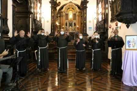 No início da oração, que foi acompanhada por centenas de pessoas pelas mídias digitais do Santuário de Nossa Senhora da Penha, os freis cantaram “A Decisão é Tua” (Vocação), canção do Pe. Zezinho. Em seguida, Frei Pedro de Oliveira apresentou as motivações do encontro, afirmando que os confrades, Valdir e Pedro Engel, “ouviram a voz do vento, chamando sem cessar, ouviram a voz daquele que chamou Francisco, Clara, tantos companheiros… Assim, somos também chamados a agradecer a Deus pelo dom da vida do frei Valdir e Pedro Engel”, comentou.