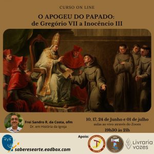 O Regional Sudeste II da OFS e da JUFRA, em parceria com o grupo Saberes e Arte, irá promover nos dias 10, 17, 24 de junho e 01 de julho de 2021 (quintas-feiras), horário de 19h30 às 21h, o curso online chamado “O Apogeu do Papado: de Gregório VII a Inocêncio III”, com Frei Sandro Costa OFM.