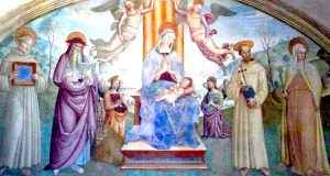 14. Clara se esforçava em ser imagem de Maria. Maria ilumina também sua morte. A Mãe de Jesus acompanha o cortejo da santas virgens que lhe aparecem no leito de morte. “…eis que, em brancas vestes, entra uma multidão de virgens, todas com grinalda de ouro na cabeça. Entre elas uma caminhava mais luminosa que as demais, de cuja coroa – que em seu cimo apresentava uma espécie de turíbulo com orifícios – irradiava tanto esplendor dentro da casa que convertia a própria noite em luz do dia. Aproximou-se do pequeno leito em que jazia a Esposa do Filho e inclinando-se sobre ela, dá-lhe um abraço cheio de ternura. É trazido pelas virgens um pálio de maravilhosa beleza e estendendo-o, todos à porfia, o corpo de Clara é coberto e o tálamo adornado” (LSC 46).