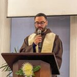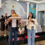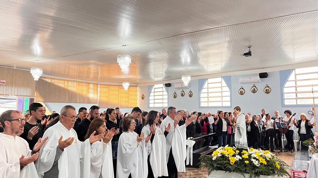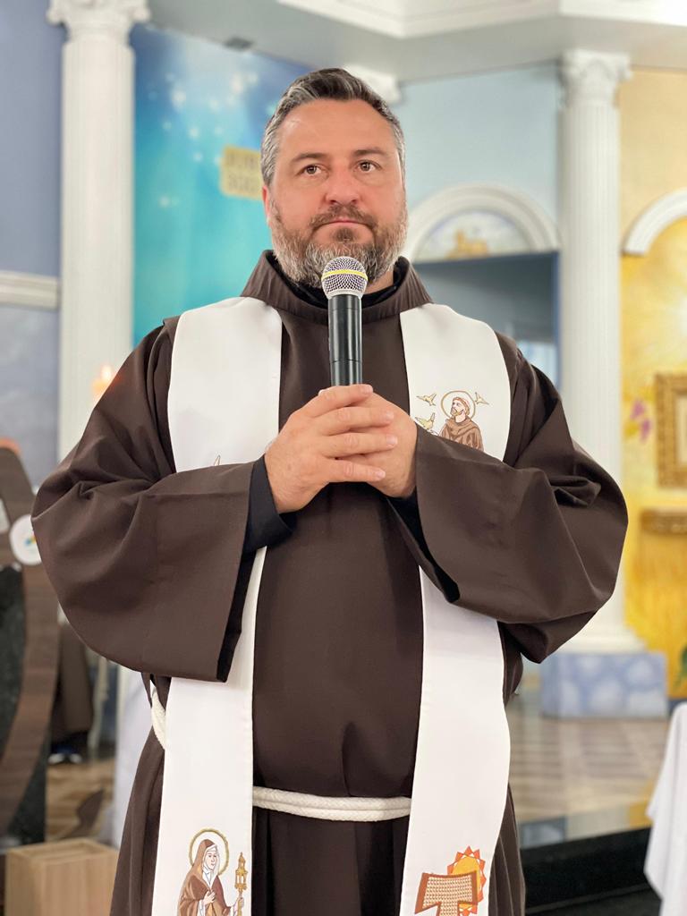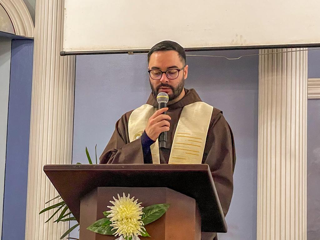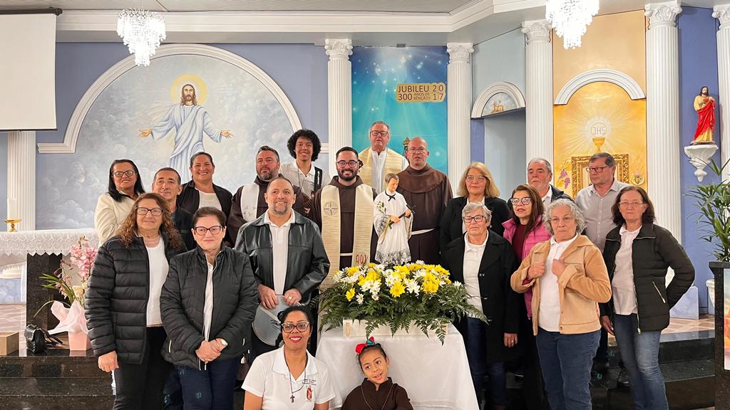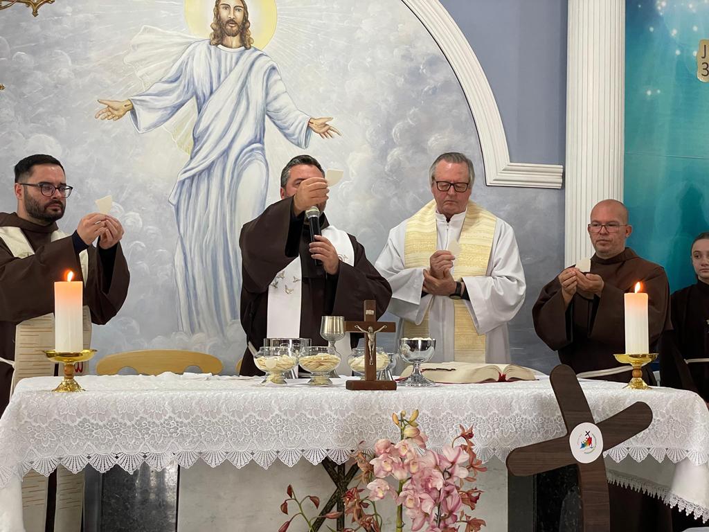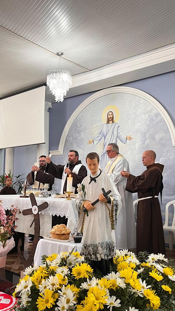 Às 10h, a Santa Missa teve início. Na procissão de entrada, ministros, coroinhas, a cruz peregrina do ano jubilar, alguns jovens representando o Grupo Mensageiros da Vida e os Freis. A Comunidade do Bairro Guarani, com a equipe Santo Expedito, foi convidada especialmente para animar a celebração festiva.