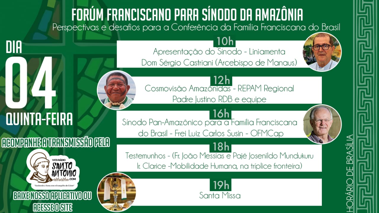 Acompanhe nos respetivos horários (horário de Brasília) a transmissão de conferências e celebrações do Fórum Franciscano para o Sínodo da Amazônia, diretamente de Manaus/AM.