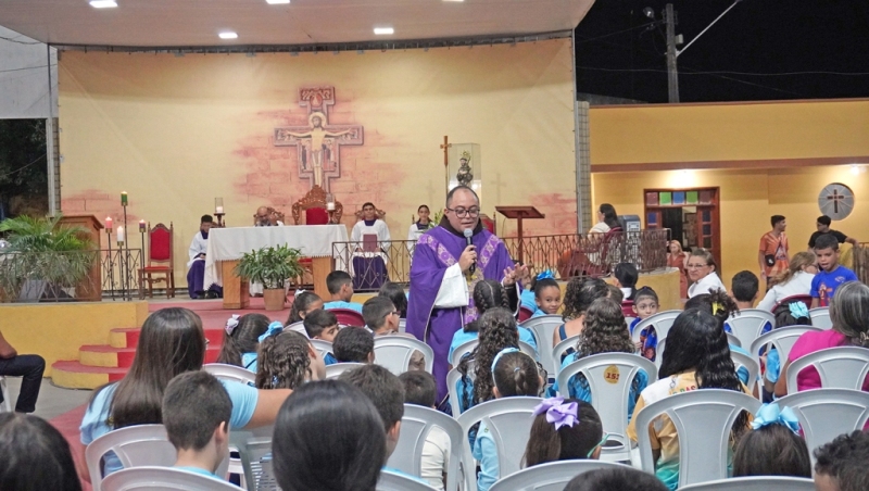 Às 18h, foi celebrada a Santa Missa, que contou com a participação especial do Terço com as Crianças. O momento foi marcado pela espiritualidade franciscana e pela vivência da fé desde a infância, reforçando a importância de conduzir as novas gerações no caminho do amor, da oração e da fraternidade. Também estiveram presentes o Reitor do Santuário-Basílica Frei Gilmar Nascimento, OFM, coordenadores do Terço das Crianças das comunidades, agentes de pastorais e devotos.