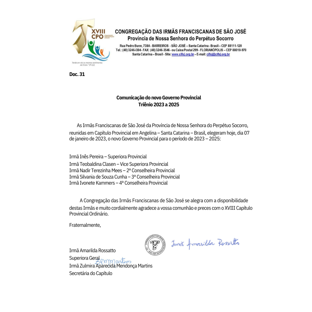 É com alegria que a Congregação das Irmãs Franciscanas de São José comunicam Novo Governo provincial da Província Nossa Senhora do Perpétuo Socorro em Santa Catarina.