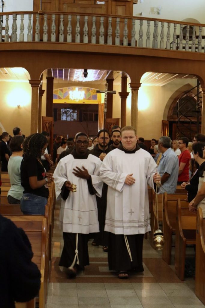 A celebração teve início com a saudação de Frei Marcos Antônio de Andrade, guardião da Fraternidade do Sagrado Coração de Jesus, que acolheu os fiéis e dirigiu palavras especiais de boas-vindas a Dom Joel Portella Amado.