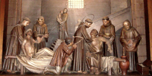 Abandonou-se então ao espírito de pobreza, ao gosto da humildade e aos impulsos de uma piedade profunda. Se até então a simples visão de um leproso o fazia estremecer de horror, passou a fazer-lhes todos os favores possíveis, com perfeita despreocupação por si mesmo, sempre humilde e muito humano; fazia-o por causa de Cristo crucificado, que, nas palavras do profeta, «foi desprezado como um leproso» (Is 53,3). Ia visitá-los com frequência, dava-lhes esmolas e, emocionado de compaixão, beijava-lhes afetuosamente as mãos e o rosto. E aos mendigos, não se contentando em lhes dar o que tinha, quereria dar-se a si mesmo – de maneira que, quando não levava dinheiro consigo, dava-lhes as suas vestes, descosendo-as ou rasgando-as para as distribuir.